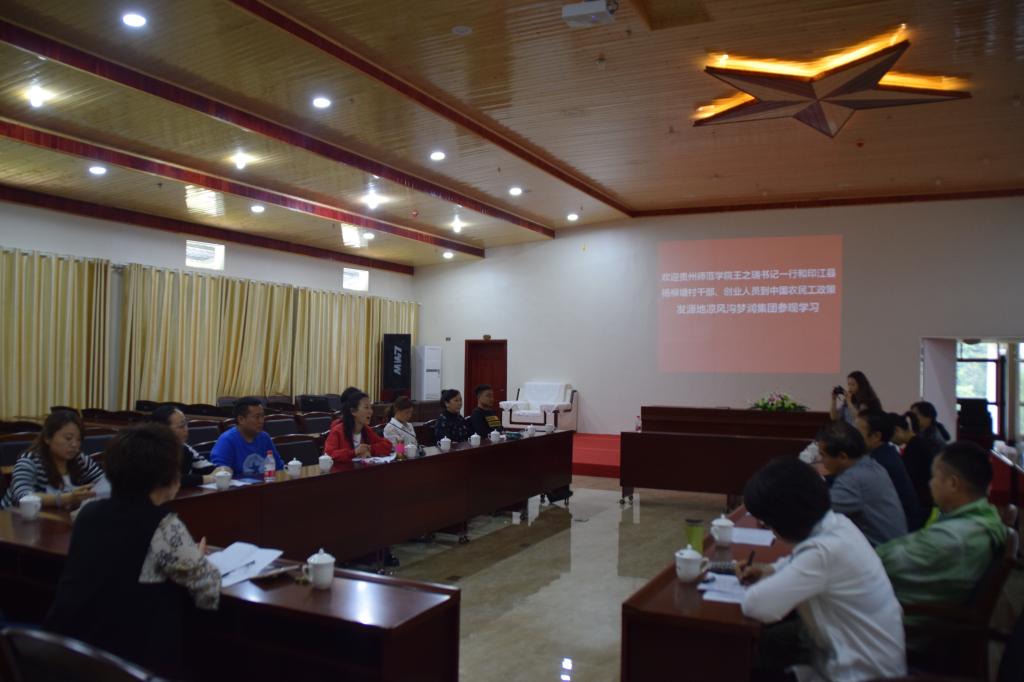 在大坎村梦润集团文化馆,通过对贵州省人大代表、大坎村第一书记、贵州梦润集团董事长张明富下乡创业个人事迹展板、梦润集团还原养猪舍、茅台集团猪草种植基地、“中国农民工政策发源地”展馆、红军崖等参观后,在村会议室“职工之家”观看了《凉风沟里走出明星大腕儿---张明富》电视宣传片后,通过邓琴邀请到了张明富在会议室进行了热烈的座谈讨论。座谈会由王之瑞主持,全体参观学习人员及张明富参加。会上,王之瑞首先对张明富返乡创业所取得的成绩表示了赞赏!对周到的参观学习安排给予了感谢!其次希望张明富结合自身奋斗经历慷慨施教,利用“可复制的张明富下乡创业扶贫模式”产生对杨柳塘村的实际帮扶效果;接着邀请张明富在适当的时候能实地到杨柳塘村传经送宝。杨柳塘支部书记熊章礼和村长熊益仁相继结合本村实际向张明富请教了产业调整、农产品销售、村党支部建设等问题,张明富不时打断问询、指导。表示:“农村经济建设一定要听中央的、一定要找准市场、一定要用经营企业的理念来经营村。农村是广阔天地,只要艰苦奋斗、自力更生就一定能取得胜利”。驻村第一书记熊德永还详细介绍了学校的帮扶情况,唐前进介绍了省委省政府有关校农结合及学校开展工作情况等。最后,邓琴对张明富的关心帮助给予了感谢!希望通过此次活动对杨柳塘村的脱贫致富有一定指导。杨柳塘村村支两委对此次参观学习表示受益匪浅,通过参观学习深受启发,鼓舞了干事创业的信心,回村之后将更加积极地带领全村脱贫奔小康。