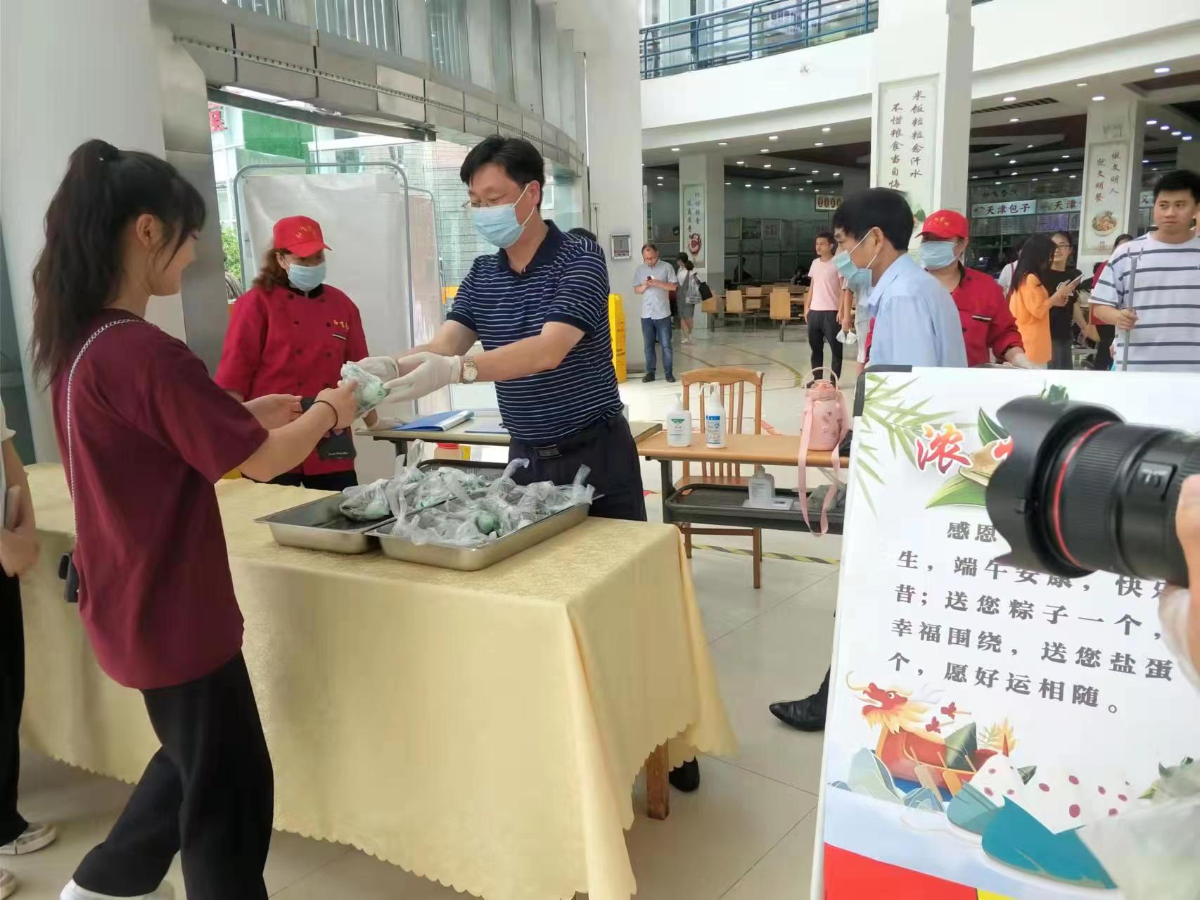 活动伊始,各食堂大门和教职工餐厅的长桌子上,摆满了提前准备的粽子和咸鸭蛋,为当天到食堂就餐的师生免费赠送1个粽子和咸鸭蛋。师生闻讯,有的从教室赶来,有的从寝室走出,图书馆的同学们也抵不住诱惑朝食堂行进,各个食堂门口排着长队,食堂及后勤工作人员纷纷为师生分发粽子,领走粽子时,还不忘一句小声的“谢谢”,喜悦的不仅是师生,也有全体后勤从业人员。小粽子传真情,粽香中透温暖,活动现场弥漫着浓浓的粽香味,气氛温馨和谐,不少老师及学生边聊边谈论端午节的各种由来传说,同学们纷纷拍照留念,共聚一堂庆祝这属于我们的传统佳节,同时,不少同学在朋友圈、抖音上纷纷表达对学校的感谢和祝福,同学们纷纷表示,“艾”情飘香满夏日,情系师院味更浓,让我们在这传统佳节共聚时,伴随师院发展,一起向未来!